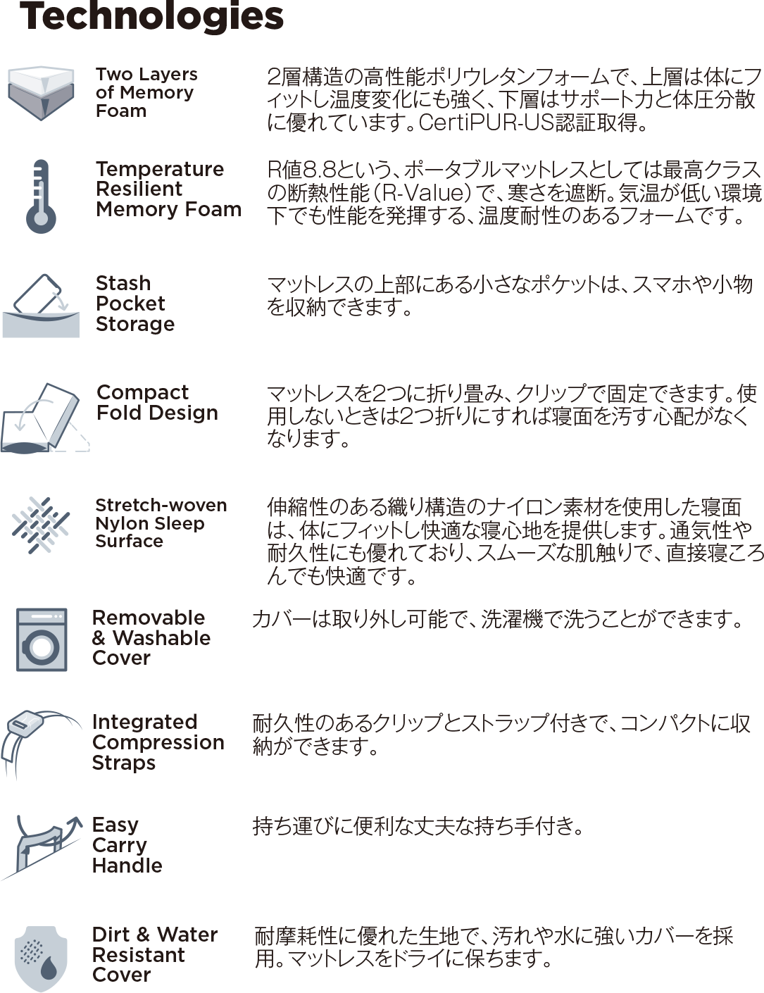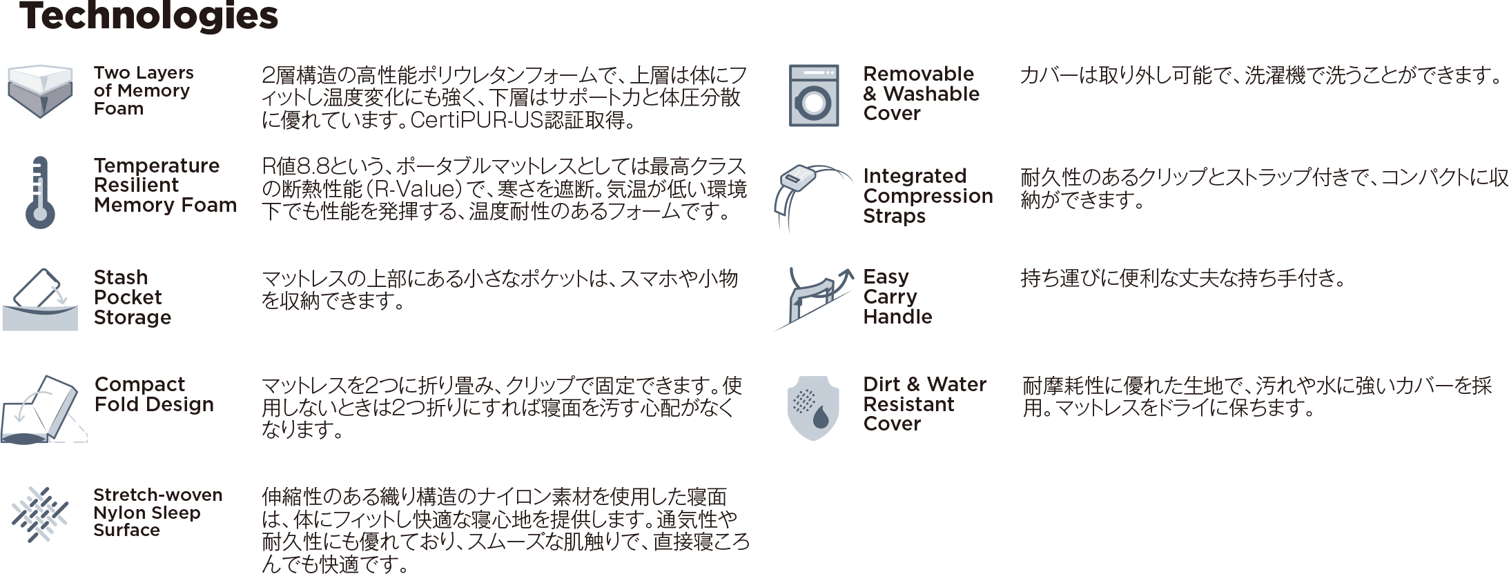 高性能ウレタンフォームにより、二人がゆったりと快適に眠れるだけでなく、冒険好きな愛犬も一緒に眠ることが可能。家庭用マットレスの快適さをそのままに、ポータブルで頑丈なキャンプ仕様を実現しました。多重レイヤー構造が体圧を分散し、温度を調整。アウトドアでの耐久性にも優れています。